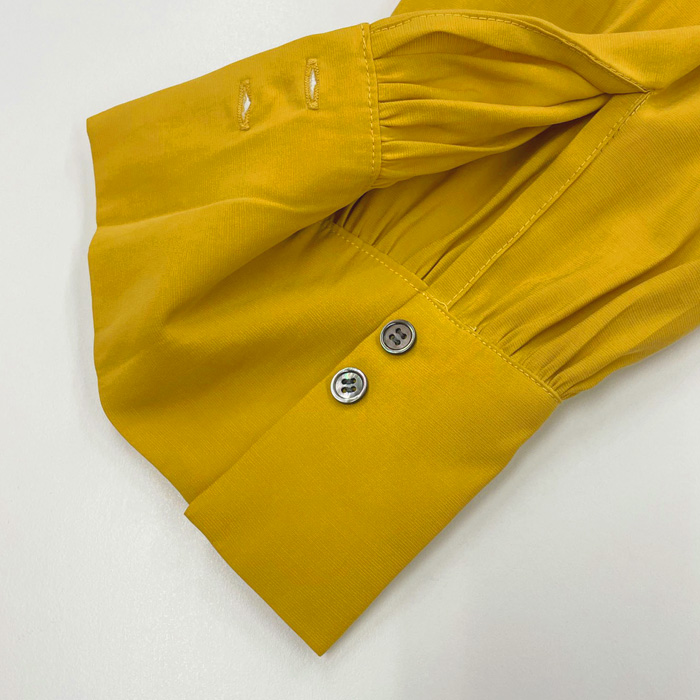 ・衿まわりやカフスまわりは、ギャザーをよせて立体的なフォルムに。カフス部分も約10cmと長めにしているので、カジュアルになりすぎず、エレガントな仕上がりに♪