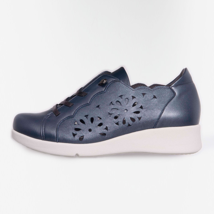 お花やレースをイメージしたカットワークで"可愛らしさ"を、ラメ紐やパール感のある牛革で"エレガントさ"を演出したスニーカー。